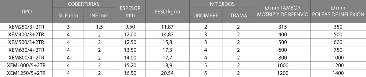 La utilización de este tipo de banda es necesaria cuando la rigidez de la banda tipo XEM no es suficiente. Está especialmente indicada para el transporte de grandes producciones, aplicaciones pesadas y de dimensiones importantes en anchura.